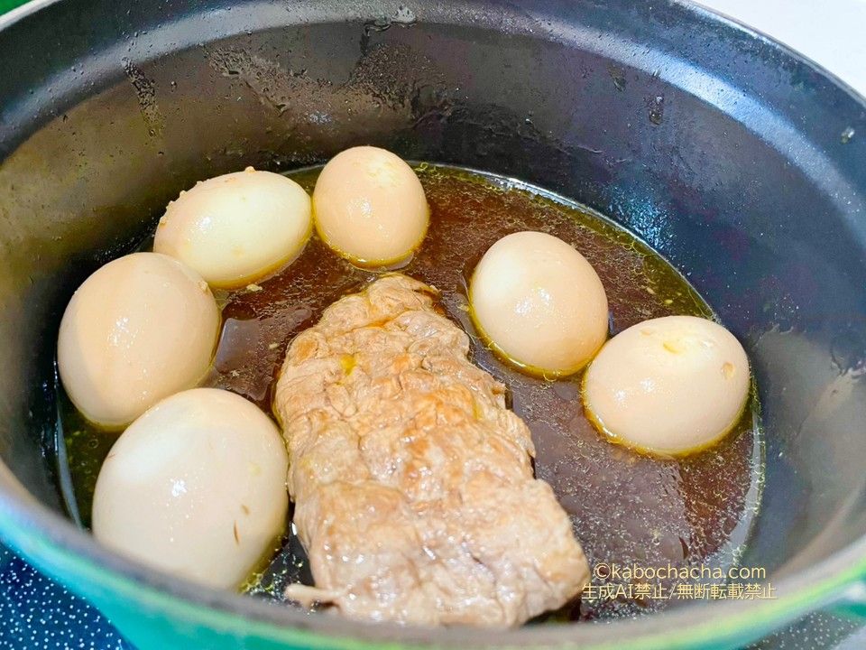 焼き目をつけて調味料(醤油・みりん・酒・砂糖・水)を入れて弱火で放置!(気力があればゆで卵も追加)