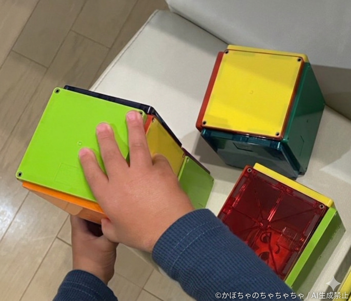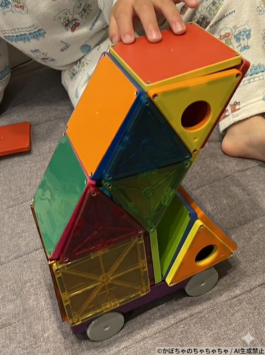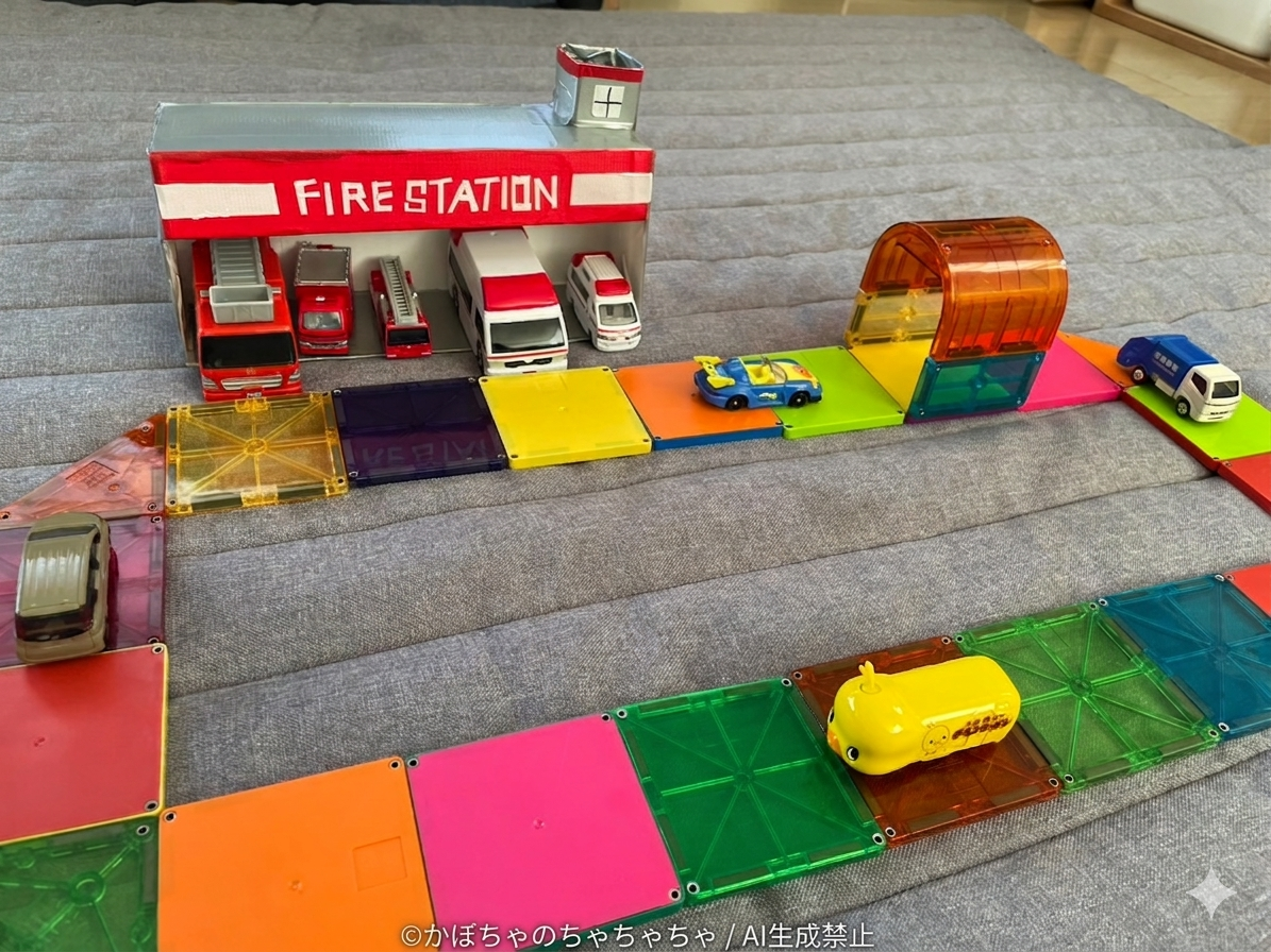 「なにつくる〜?」とワクワクしながら、おままごとや車遊びと組み合わせて遊んでいます。